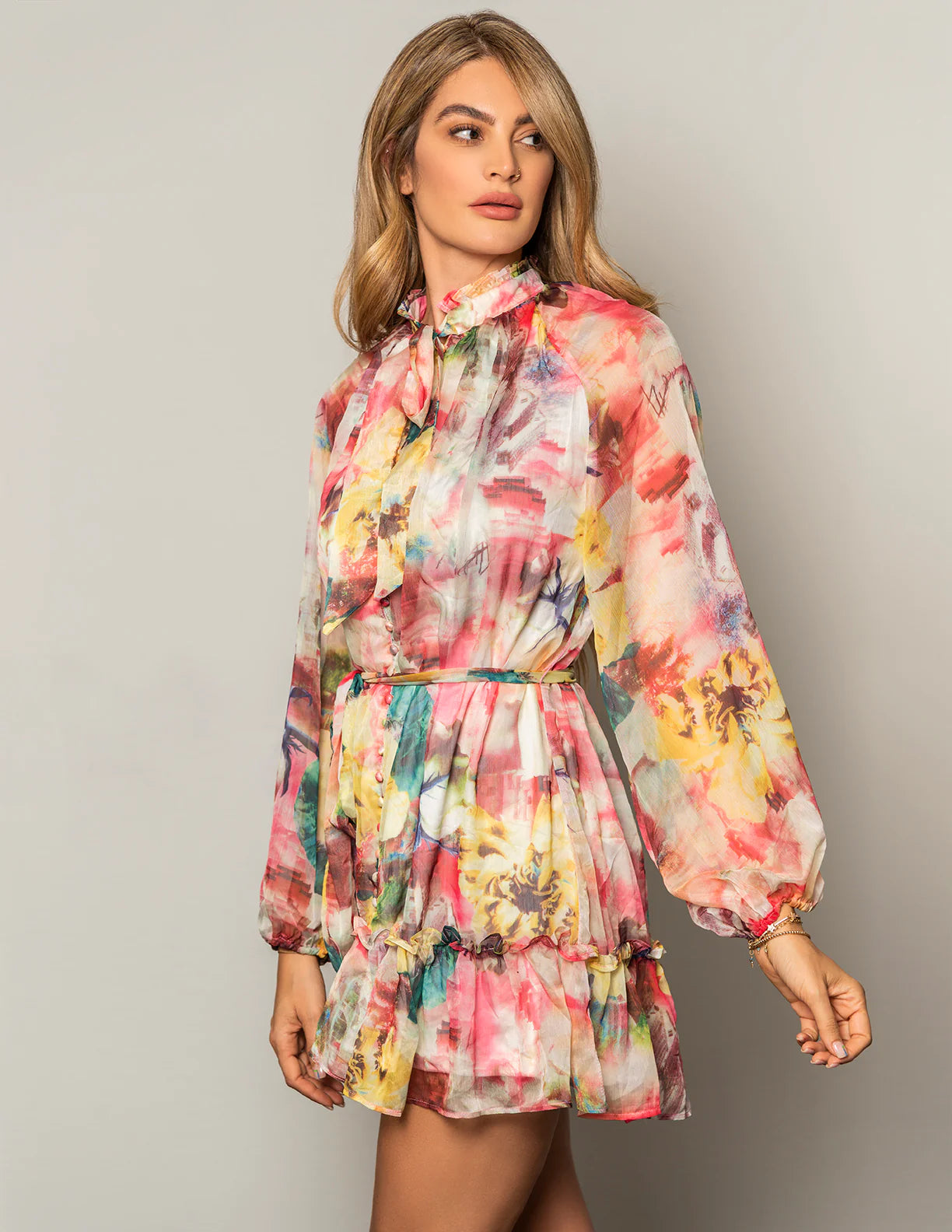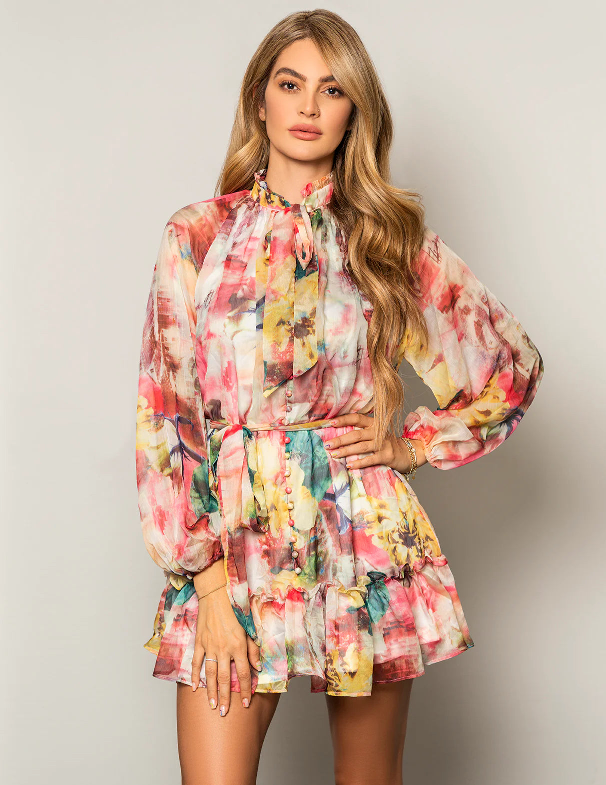 Fun, flowy, flirty, floral dress. Button, neck tie, and waist tie details. Has soft lining.
