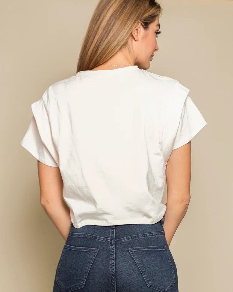 This playful crop top features charming ruffle sleeves, a flirty crisscross V-neckline, and a comfy elastic waist for the perfect fit.